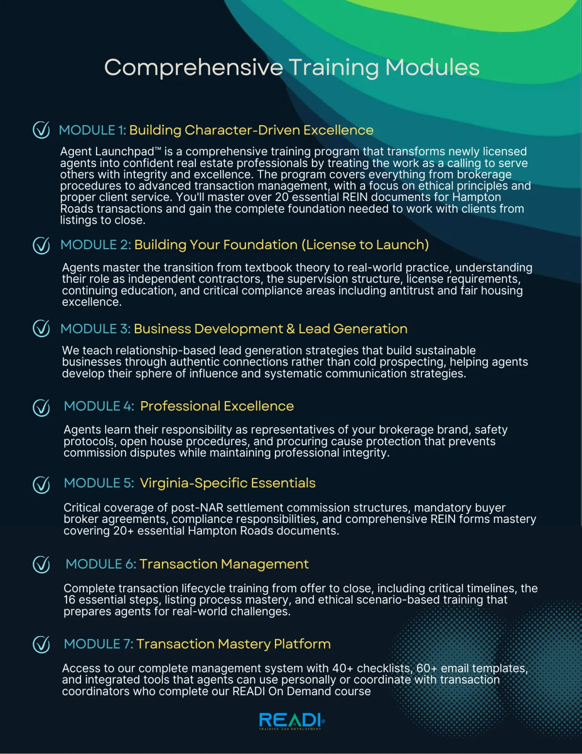 A: Yes, Agent Launchpad™ is specifically designed for Virginia real estate agents. The course includes extensive coverage of DPOR requirements, Virginia Fair Housing laws, post-NAR settlement regulations, and Hampton Roads market specifics including complete REIN forms training. This local focus ensures everything you learn is immediately applicable to your Virginia practice.